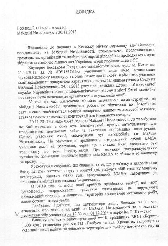 "ПіК"у вдалось отримати службовий документ – Довідку "Про події, які мали місце на Майдані Незалежності 30.11.2013". В ній зокрема стверджується, що у ключовий момент конфлікту "окремі працівники міліції з метою захисту життя та здоров'я… індивідуально прийняли рішення про застосування спеціального засобу ПР" (ПР – це "палка резиновая", не плутати з партією регіонів – ПіК).