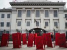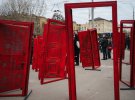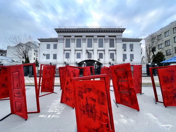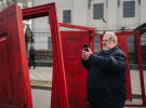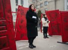 Біля посольства Російської Федерації у Києві встановили 11 зламаних дверей на підтримку кримських політв'язнів.