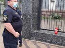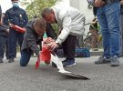 Картонний макет кремлівських башт розмістили на асфальті, полили запалювальною сумішшю та підпалили. За мить правоохоронці з вогнегасником загасив шматок картону, що обурило активістів.