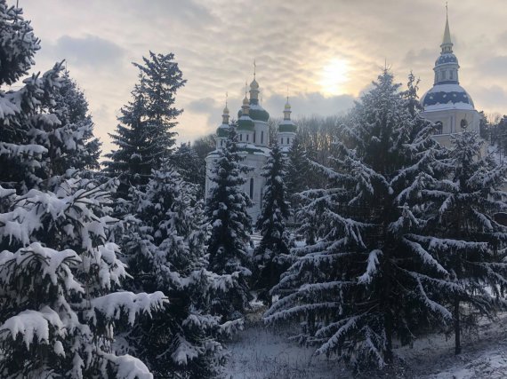 На знімках видно, що в саду нікого. Рослини та стежки покрилися пухким снігом. Особливо атмосферний вигляд має Видубицький монастир в оточені високих ялин. Працівники саду кажуть, що саме такою була задумка проєкту ландшафтного архітектора Леоніда Рубцова.