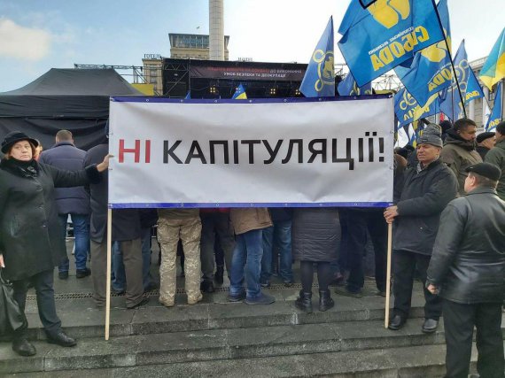 Дехто розгорнув гасло "Ні капітуляції". Ним звертають увагу Зеленського на бачення урегулювання війни на сході України.