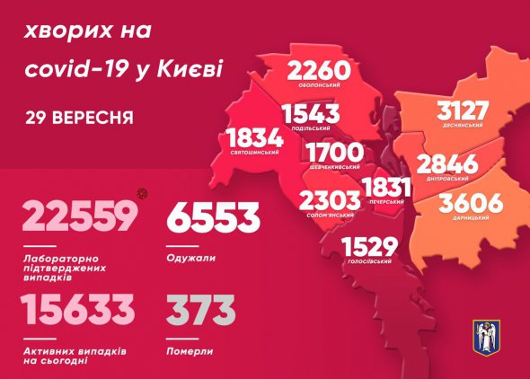 Станом на 30 вересня, інфікованих Covid-19 побільшало на 219. Це найнижчий показник за останній період коронаепідемії в Києві. Загалом підтверджених випадків захворювання вже 22 778.