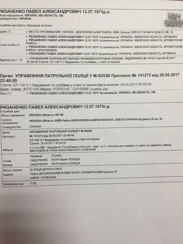 "28 травня о 22:48 народного депутата від БПП Павла Різаненка, перебуваючи в стані сильного алкогольного сп'яніння, затримало управління патрульної поліції Києва. Про це свідчить витяг з бази", - інформує громадський діяч Олег Кіщук.