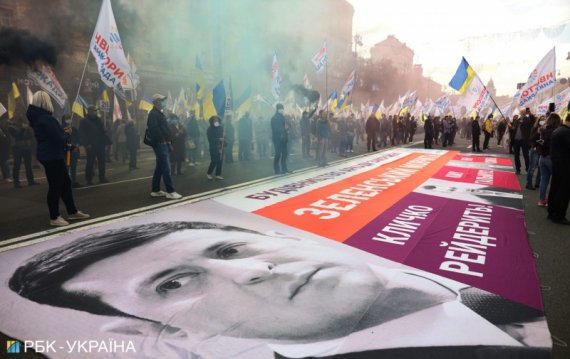 Димові шашки та гігантський плакат Зеленського: на Хрещатику відбулась акція протесту