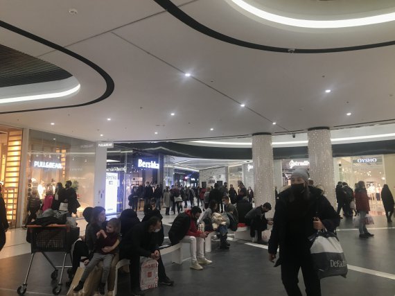 На вході всім міряють температуру та радять оброблювати руки антисептиком. У холі з фонтанами шумно. До деяких магазинів стоять довгі черги. У "Цитрусі" важко знайти вільного консультанта.