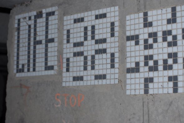 Попереду підземелля роздвоюється. Посередині на проміжку – вертикальна іржава труба. На ній напис помаранчевою фарбою "Скінхеди". Кирило пропонує зробити фото й готуватися до повернення.