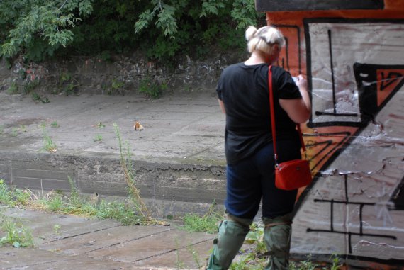 Група взувається під дерев'яним навісом ліворуч. За кілька хвилин рушаємо через парковку до дерев'яних сходів з різнокольоровими написами. Дехто несе бахіли в руках. Заходимо під бетонний навіс – всередині яскраві написи-графіті. Під ногами – де-не-де каміння, під стінкою – скелет від смаженої рибини.