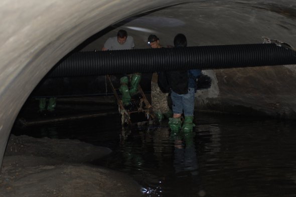 Далі йдемо рівним бетонним коридором. Долаємо ще дві труби, закріплені нижче за першу. З отворах у стінці струменить вода. Подекуди видно каналізаційні люки, з яких скапує дощ.