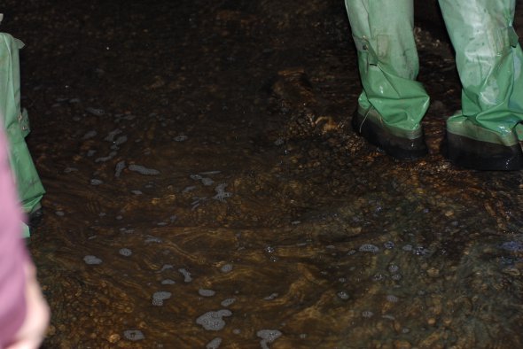 З прочиненого каналізаційного люка стікає вода. Шум річки під ногами стає гучнішим. Світло від ліхтариків створює містичну атмосферу.