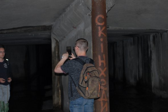 – Тут найглибша ділянка колектора, – каже Кирило. – Інколи за нами зав'язуються якісь зайці, які думають на халяву екскурсію послухать. Знаю, що вони дійдуть до цього відтинку – і все. Вода там буде майже до верхньої частини бахіл. Якщо йти лівіше – трохи вище дно. Трубу або знизу можна перелазити або зверху – там притарабанили драбину. Згодом її знімуть, але поки є.