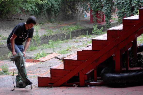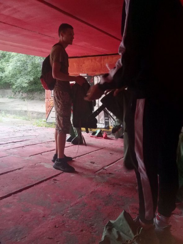 Долаємо найвищу трубу. Намагаюся ступати лівіше, проте набираю води через халяву бахіли. Іду до виходу з повним важким "чоботом". Назовні вже стоїть хлопець у синій куртці. Знімає бахіли. Каже, що теж промочив ногу й теж ліву.