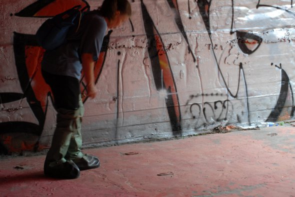 З "відмашкою" рушаємо до бетонного парапету. За ним – прямокутний вхід у колектор. Стіни розмальовані рожевими, синіми, червоними написами. На м'якому намуленому ґрунті – сліди ніг. Чути сильний гул води. Кирило йде попереду.