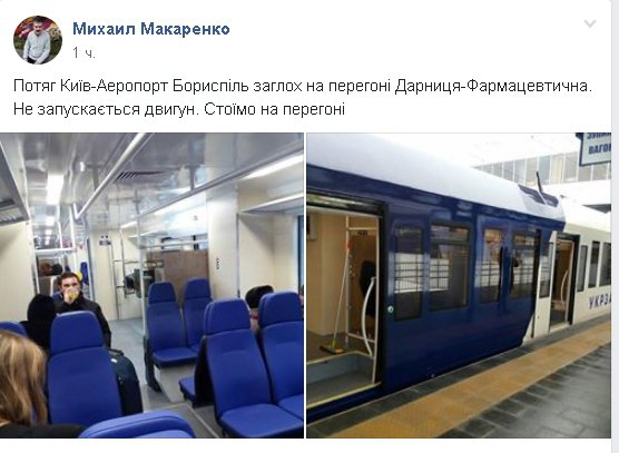 "Потяг "Київ-Бориспіль" заглох на перегоні Дарниця-Фармацевтична. Не запускається двигун", - пише пан Макаренко.