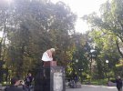 Одна з них в образі американської поп-діви Монро залізла на колишній пам'ятник героям Жовтневої революції, що перед Верховною Радою.