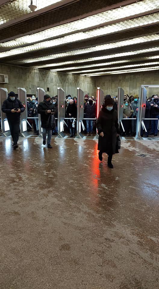 На станції, уточнив Калугін, працював лише 1 вхід. На 2-му встановлюють турнікети сучасного зразка. Пасажири в черзі не дотримувалися соціальної дистанції.