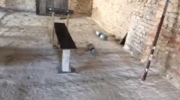 Споруда без даху, стіни вкриті тріщинами, в одному з приміщень розташований саморобний спортзал.