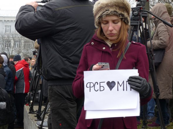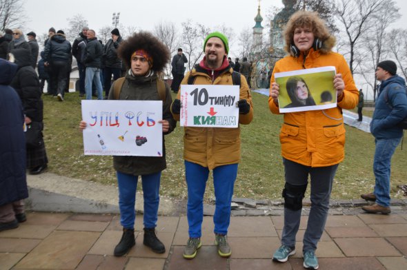 Противники храму тут зібрались від трьох різних рухів. Радикали з "С14" та "Правого сектору" сходяться на 12:00. Збираються за спинами тих хто моляться. на схилі розгортають великий банер з зображенням схожого на президента РФ Володимира Путіна на фоні палаючого Кремля.