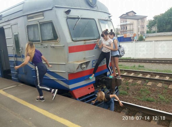 "Чиї безстрашні дівчата? Батьки, впізнайте своїх дітей і проведіть виховну роботу. Це може закінчитися плачевно. Одне невдалий рух, і потяг розтягне кишки по рейках", - йдеться в повідомленні dtp.kiev.ua в Facebook.