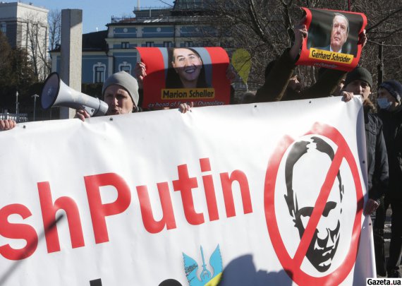"В Німеччині досі діють, або мають власність, особи, що лобіюють інтереси кремлівського диктатора. З Путіним пов'язують колишніх посадовців, таких як канцлер Герхард Шредер, голова федеральної канцелярії Маріон Шеллер, директор Deutsche Bahn Гартмуд Медорн, чи колишній оперативник "Штазі" Матіас Варніг. Володимир Якунін, людина з оточення Путіна, має в Берліні філію свого фонду "Діалог цивілізацій", через який просуває пропагандистські наративи Кремля. А російські олігархи Олег Дерипаска, Роман Абрамович, Алішер Усманов, та й сам Путін, володіють майном у Німеччині", - йдеться на фейсбук-сторінці Руху опору капітуляції, який і організував акцію.