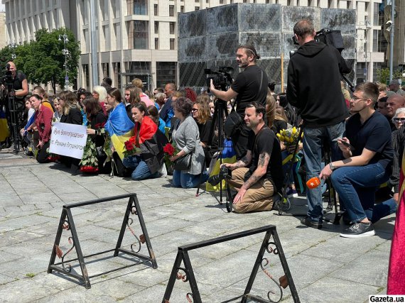 Труну з тілом бійця привезли на Майдан після заупокійної служби, яка проходила у Михайлівському соборі столиці. Люди зустрічали загиблого ставши на коліна, повідомляє кореспондентка Gazeta.ua.