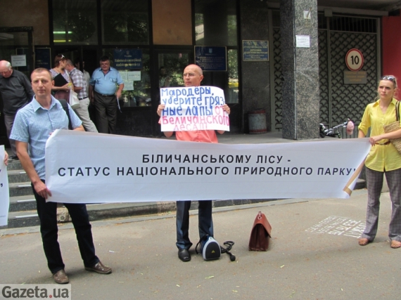 Люди тримали плакати з гаслами: "Проспали Кончу-Заспу, прогавили Жуків острів, проморгали Пущу-Водицю, на черзі - Біличанський ліс?","Руки геть від Біличанського лісу!", "Янукович Садовському не указ?", "Зупинити дерибан майбутнього національного природного парку "Біличанський ліс".
