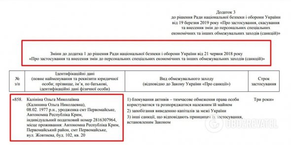 Як би там не було, але в 2019 році було опубліковано указ президента №82/2019, який вніс зміни до рішення РНБО: персональні дані киянки Ольги Калініної прибрали, а додали правильні – кримської пособниці країни-агресора.
