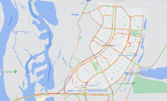 Діставатися центру з Троєщини складно. На вул. Оноре де Бальзака, Маяковського затори. Інтенсивність руху на Північному мосту повільна.