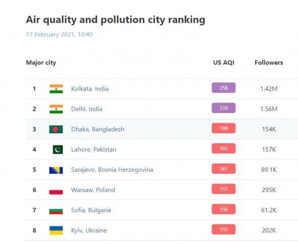У середу, 17 лютого, Київ зайняв 8-ме місце в рейтингу міст за рівнем забруднення повітря. Станом на ранок індекс забруднення становив 155 за норми 50.