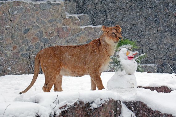 Фото левів, тигрів та інших тварин, які бавляться зі сніговиками, опублікував столичний зоопарк на своїй сторінці у Facebook.