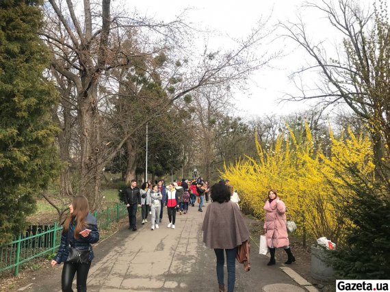 Деякі дерева вже обпадають, але більшість лише починають квітнути. Розпустилися сакури. Люди стають у чергу, щоб сфотографуватися біля рожевого дива.