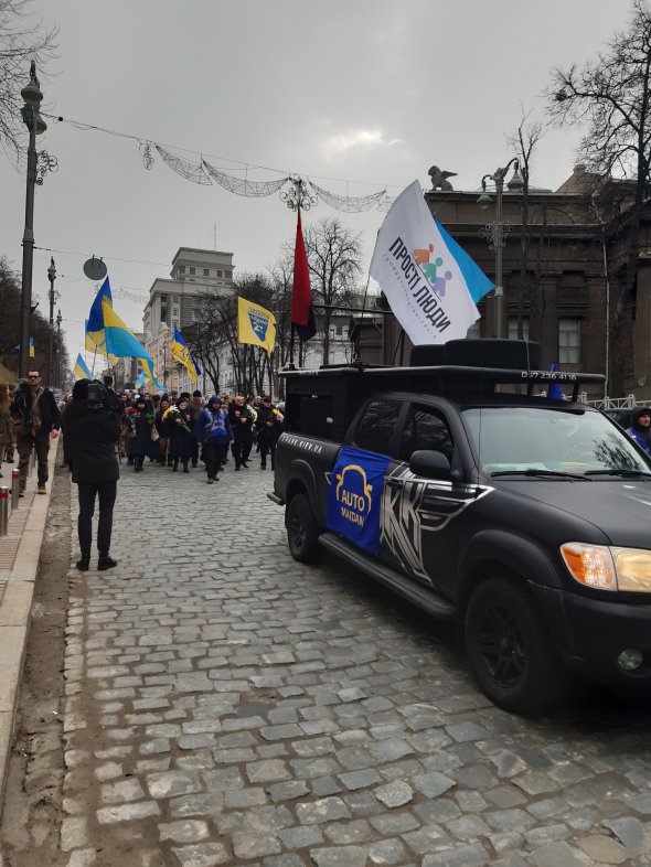 До активістів під'їжджає чорний позашляховик, на якому майорить синьо-жовтий, червоно-чорний та прапор громадської організації "Прості люди". На задніх дверцятах стяг Автомайдану. Авто очолює колону, яка рушає вулицею Грушевського під крики "Слава Україні" та гучну патріотичну музику, що лунає з колонок. Дорогою до Ходи долучаються люди.