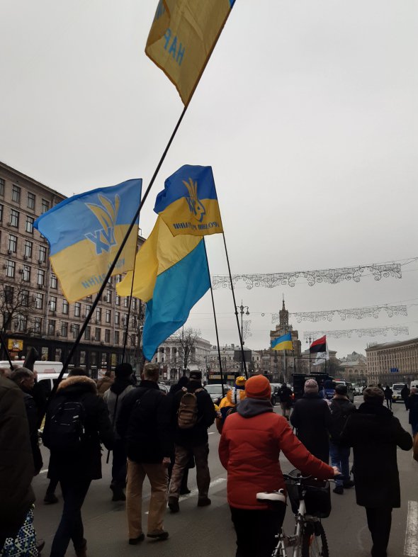 "Сьогоднішній захід - це зібрання учасників Революції гідності, які, перш за все, хотіли б вшанувати героїв Небесної сотні, українських військових, загиблих на сході, і які хотіли б нагадати владі про те, що вимоги Революції гідності досі не виконані", - каже один із організаторів, коли колона проходить повз Верховну Раду України. Називає депутатів нелюдами.