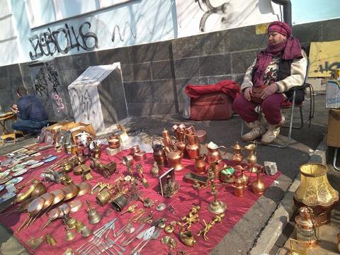 "Останнім часом на Андріївському туристів поменшало, - додає його колега Олена. Продає радянський посуд та українську вишивку на Андріївському протягом 12 років. - Натомість з'явилось багато ромів. Ходять таборами".