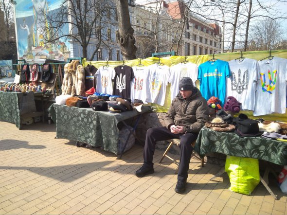 "Ми ходили на прийом до КМДА, але це не допомогло, - розповідає Олександр. Торгує футболками з національною символікою. - На Алеї художників люди вигулюють собак, тусуються бомжі. Що я там робитиму, в доміно гратиму й водку питиму? Я тут 20 років торгую. Зараз заробітки — такі собі. Основними покупцями завжди були туристи, які гуляли по Андріївському, працівники дипломатичних посольств. А зараз тільки турки ходять, яким не футболки мої треба, а українські дівчата".