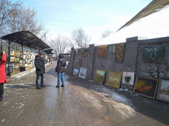 "Про переселення колег на Алею художників чули. Але усім там не вистачить місця. Говорять, що жодного будівництва на тому місці поки не планують. Просто хочуть навести порядок. Інша річ, що переселення не на часі. Зараз українці переживають важкі часи, сутужно з роботою. От я пенсіонерка. Платять мізер, доводиться якось перебиватися. На товарах особливо не наварюю. В ціну до собівартості виробу додаю перевезення і 15 відсотків. З того сплачую податок на благоустрій. Хоча, який він тут, бачите самі — сніг і сміття не прибирають. Ми робимо це самі".