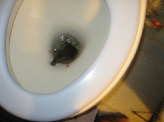 "Це було в суботу о 15.00. Я помила підлогу й хотіла воду вилити в унітаз. Попросила чоловіка перенести відро, бо воно було досить важке. Коли він вилив воду, ми почули, ніби щось хлюпнуло. Ми туди заглянули і звідти винирнув великий щур. Розумієте? І він почав шкрябатись по раковині! Потім ми почали зливати воду, але він не змивався. Коли ми брали Доместос чи хлорку, то він ховався в трубу, а коли змивали чисту воду, то знову винирював", - коментує Ольга Євгенівна.