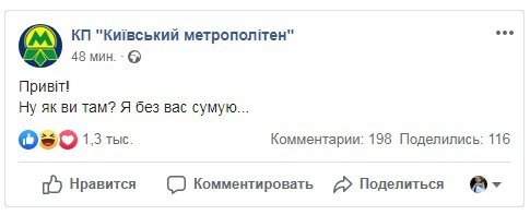 Поки київська підземка не працює, а люди стоять у великих чергах на наземний транспорт, Київський метрополітен веселить киян у Facebook.