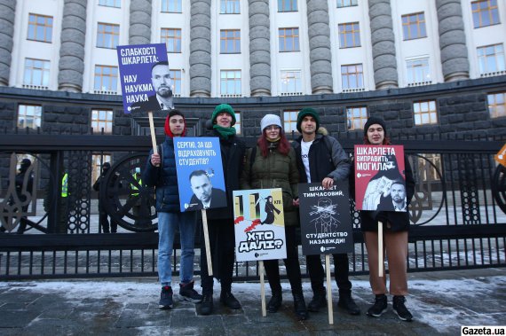 Студенти Києво-Могилянської академії страйкують під Кабінетом міністрів із вимогою звільнити міністра освіти Сергія Шкарлета.