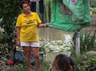 У дворі повсюдно лежить хатнє начиння, що сушиться після підтоплення: телевізори, пральна машина, холодильники і одяг. Господиня має у дворі три будинки, здає кімнати, з того й живе. Веде до одного з них.
