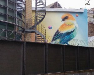 "На стіні посольства з'явився яскравий птах, якого випускають на свободу людські руки. Правда, щоб побачити руки, потрібно залізти на парапет - посольство обгороджено високим парканом і не кожен бажаючий зможе все побачити", - розповів місцевий житель Олег.