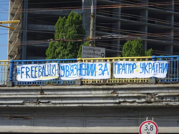 "Зробили і вивісили з друзями банери на підтримку Володимира Балуха на Повітрофлотському та Шулявському мостах. Попереду нові точки. Акція "Володимир Балух - прапор української незалежності" триває", - повідомив учасник акції Олег Слабоспицький.