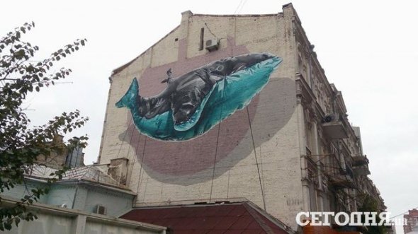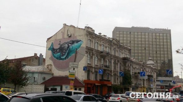 У Києві на вул. Саксаганського, 145-а на фасаді старовинного будинку з'явився новий мурал кита, що пливе.