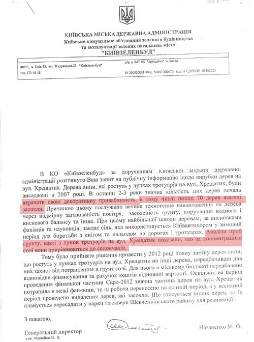 "Найбільше шкоди деревам завдає сіль, яка використовується Київавтодором у зимовий період. Аналізи проб ґрунту, взятті з лунок тротуару на Хрещатику, показали, що за концентрацією солі він прирівнюється до солончаків", - наголошували тоді у Київзеленбуді.