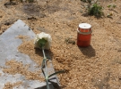 На хрест повісили аркуш паперу, на якому написано "Жертвам голодомору та політичних репресій в Україні Тимчасовий пам'ятний знак".