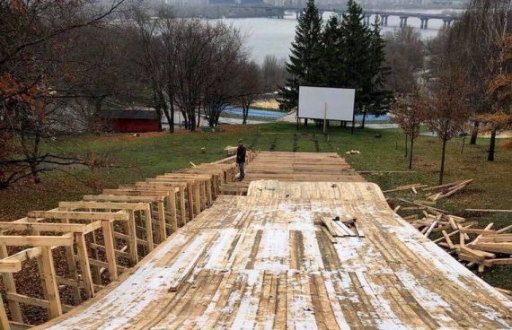 Зараз завершується процес монтажу майбутніх гірок. Дерев'яні опорні конструкції вже встановили. Далі на них покладуть спеціальне покриття, на якому можна кататися за будь-якої погоди, навіть без снігу.