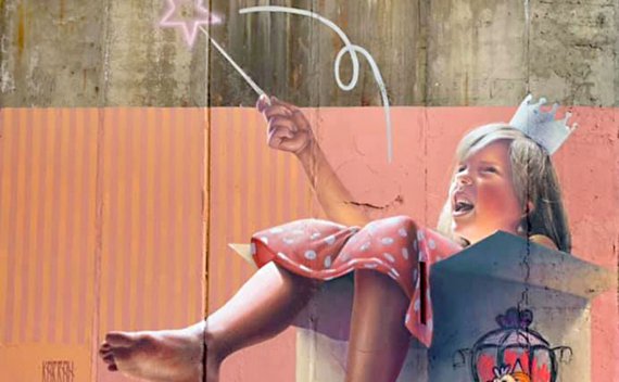 На стінописі зображена дівчинка, яка сидить у картонній коробці з чарівною паличкою у руках.