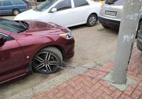 У Києві помітили авто, яке водій посадив на ланцюг. Зробив це нібито для того, щоб машину не забрав евакуатор.