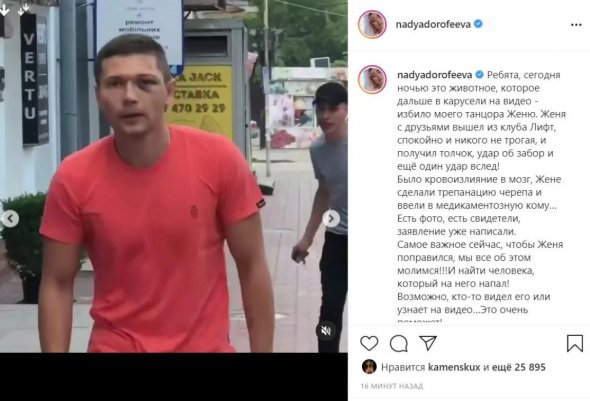 Раніше співачка Надя Дорофєєва заявила, що невідомий побив її танцюриста Євгена. У той день хлопець із друзями вийшов з клубу "Ліфт".