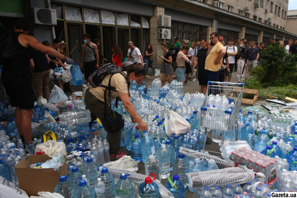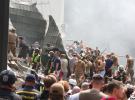 Повітря сіре від бетонного пилу. Рятувальники й звичайні кияни вилізли на обвалений дах відділення. Шланг з водою тримають високо над уламками десятки чоловіків. Поливають ще розпечені руїни й одночасно намагаються пробратися всередину.