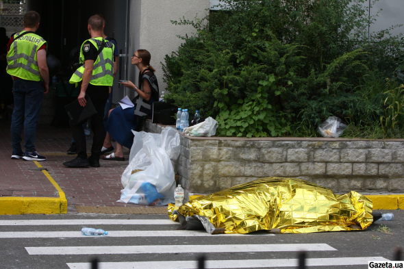 Проїзд до вул. Раїси Окіпної, 8В перекрили правоохоронці. На тротуарі під клінікою "Ісіда" на ношах лежить тіло. Його з головою накрили фольгою. Це - будівля медичного центру матері й дитини, у яку влучили уламки російської ракети. Також по-сусідству розташована клініка ADONIS.